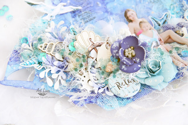 Из ОЭ: металлические элементы (цепь с якорем, подвеска осьминог и морская звезда), топпинги (голубенькие камушки), глиттер и пайетки, марля и кружево.